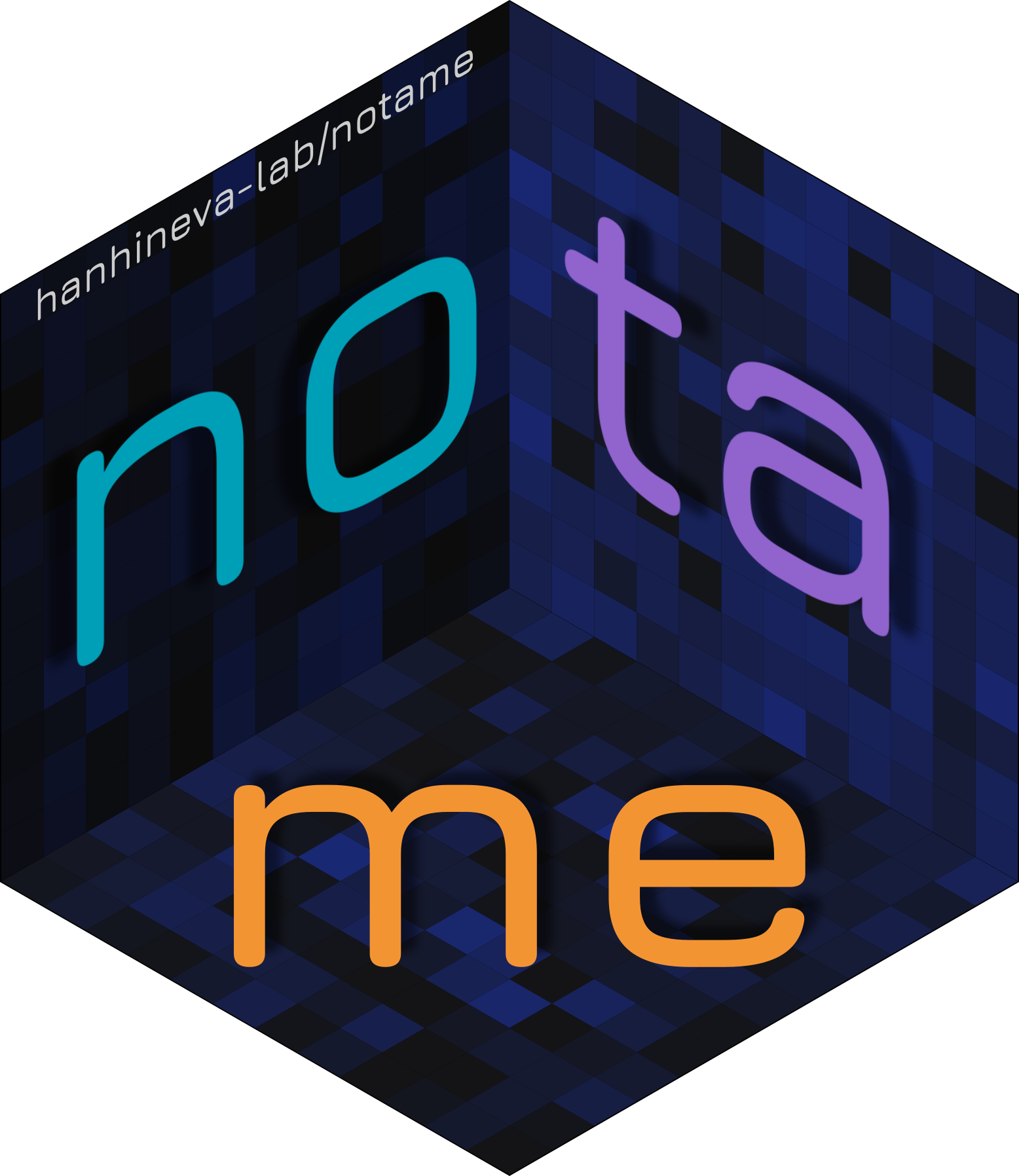 The notame packages can be used to analyze preprocessed LC-MS data in non-targeted metabolomics. Notame was developed at the research group of nutritional metabolomics at University of Eastern Finland and Afekta Technologies, a spinoff metabolomics company. We use notame as a way to bundle together all the preprocessing methods we use for our non-targeted LC-MS metabolomics data, so it mainly consists of methods found in other packages, and a bunch of visualizations we have found useful.